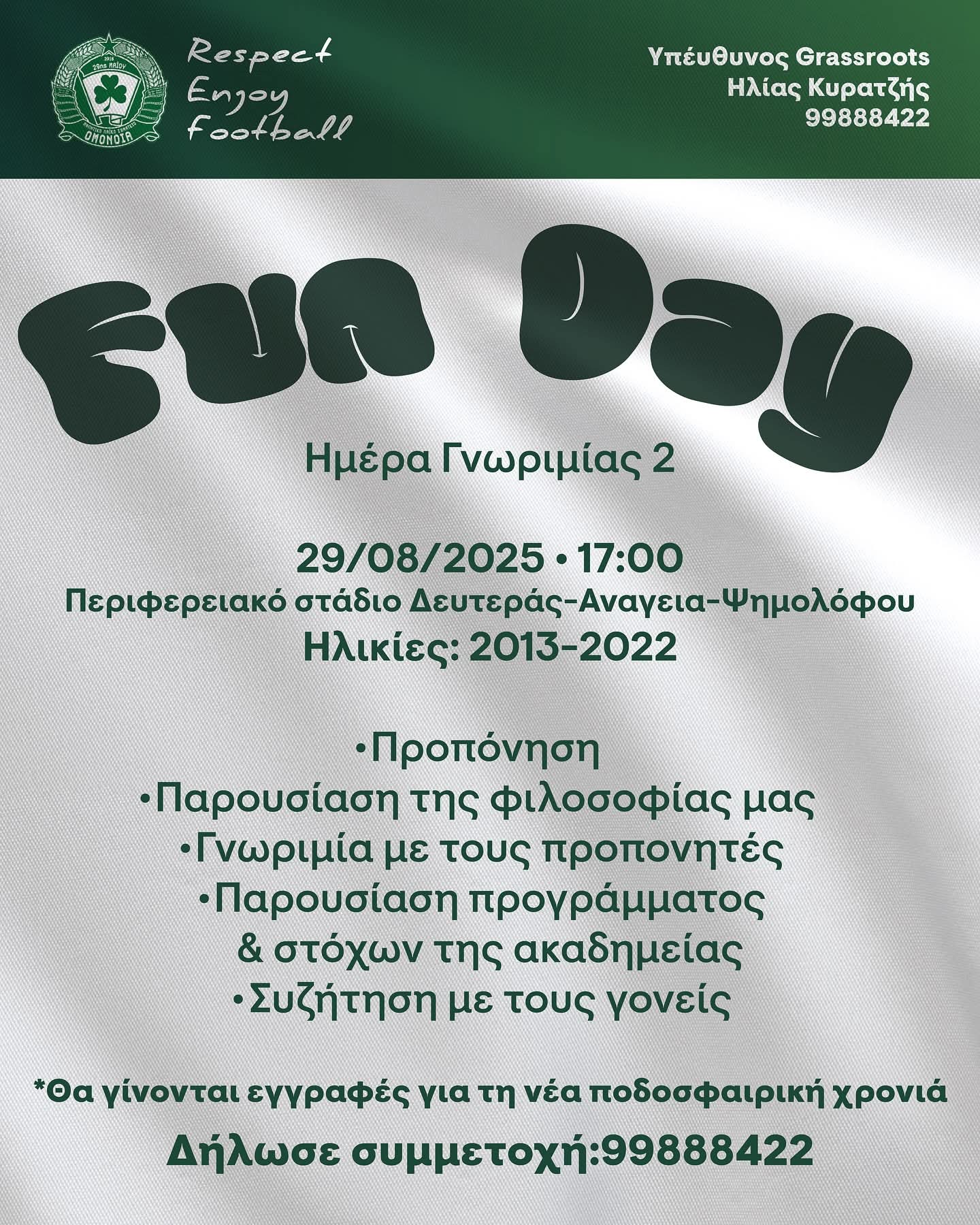 Δηλώσεις συμμετοχής στον υπεύθυνο Grassroots, Ηλία Κυρατζή, στο 99888422.