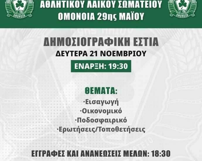 Μέσω ανακοίνωσης της η ΟΜΟΝΟΙΑ ενημέρωσε για το πρόγραμμα της Γενικής Συνέλευσης του Σωματείου μας, η οποία θα γινει τηνΠερισσότερα