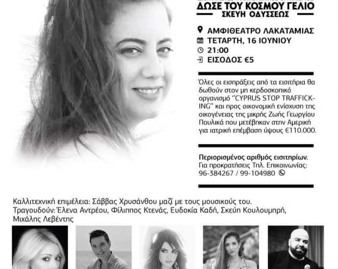 ΜΙΑ ΑΓΚΑΛΙΑ ΤΡΑΓΟΥΔΙΑ ΓΙΑ ΤΗΝ ΣΚΕΥΗ🤍 Τιμή εισόδου €5. Συναυλία φιλανθρωπικού χαρακτήρα στο αμφιθέατρο Λακατάμιας, την Τετάρτη 16/6 στις 21:00.Περισσότερα