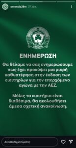 Μικρή καθυστέρηση προέκυψε σχετικά με την έκδοση των εισιτηρίων για τον αγώνα του Σαββάτου απέναντι στην ΑΕΖ, όπως ενημέρωσε το Σωματείο μας.