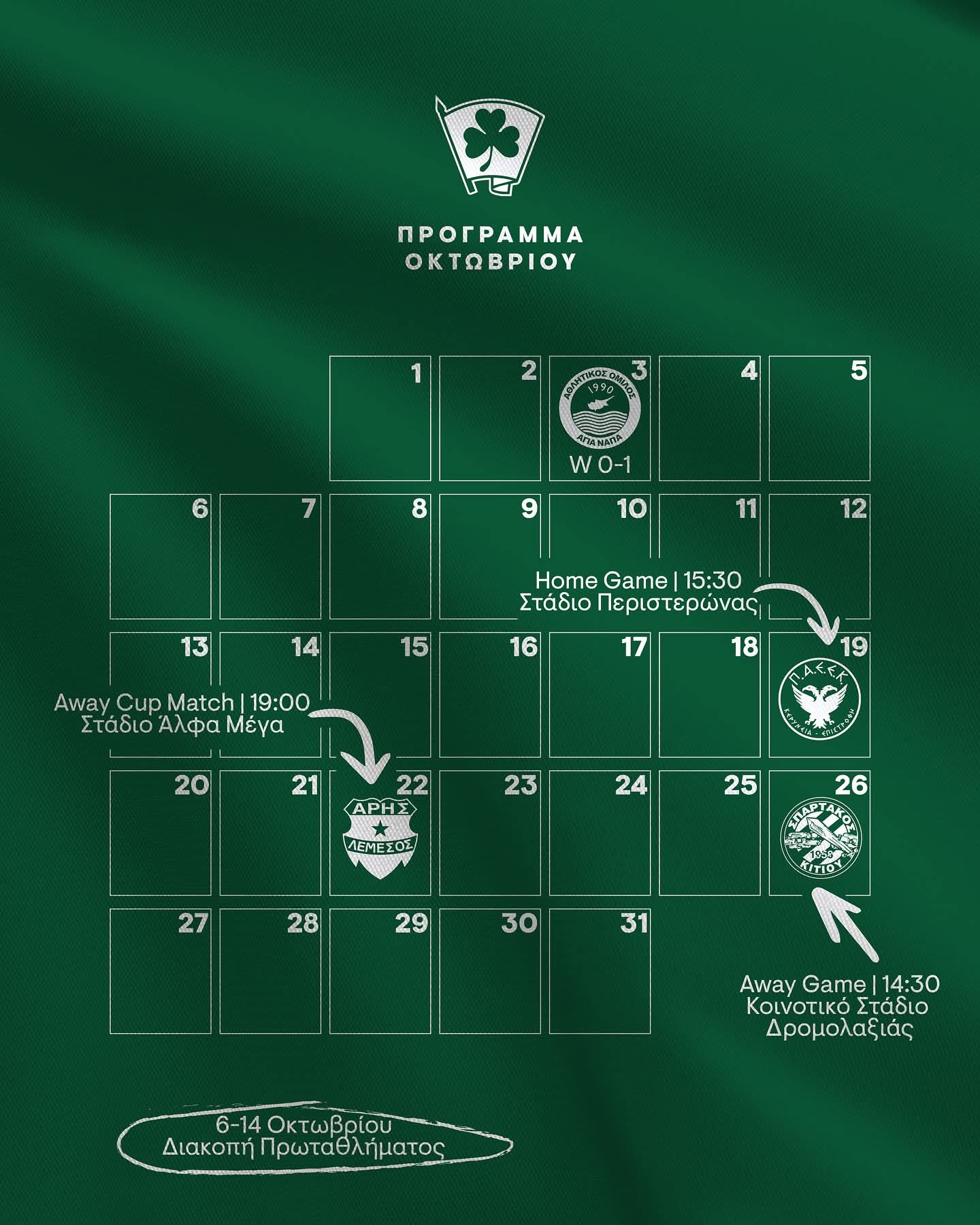 Οι υποχρεώσεις για τον Οκτώβριο κλείνουν την Κυριακή 26 του μήνα με το εκτός έδρας παιχνίδι απέναντι στον Σπάρτακο Κιτίου για την 6η αγωνιστική του πρωταθλήματος. Ο αγώνας έχει οριστεί στο Δημοτικό Γήπεδο Δρομολαξιάς και θα αρχίσει στις 14:30.