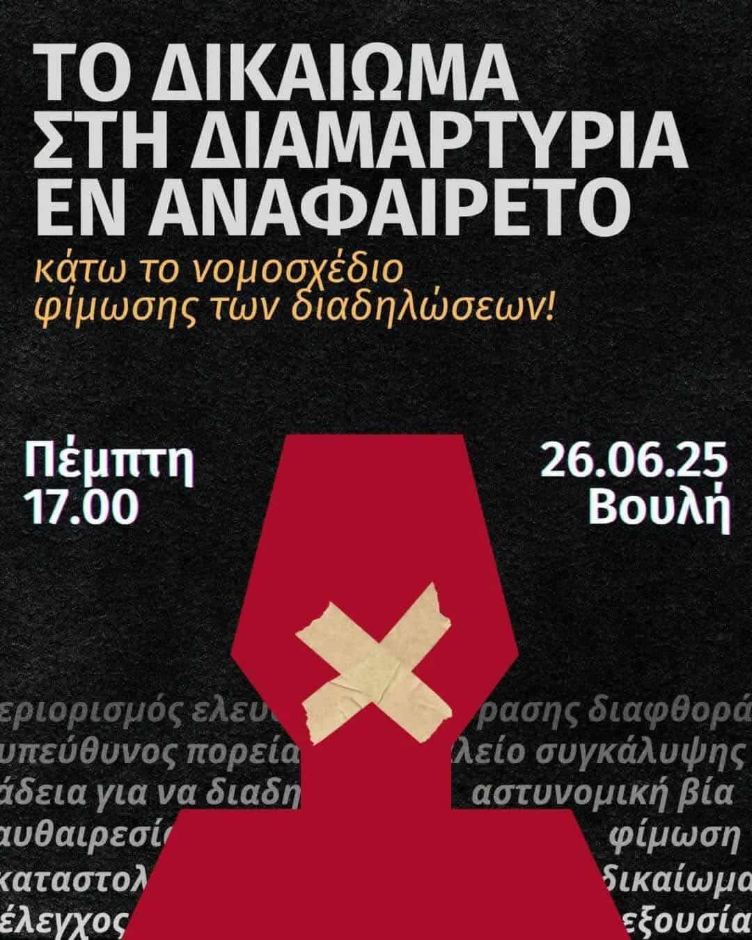 Όχι στον νέο τρομονόμο που περιορίζει τις διαδηλώσεις – Στηρίζουμε την εκδήλωση διαμαρτυρίας που διοργανώνεται έξω από τη Βουλή την ερχόμενη Πέμπτη στις 17:00.