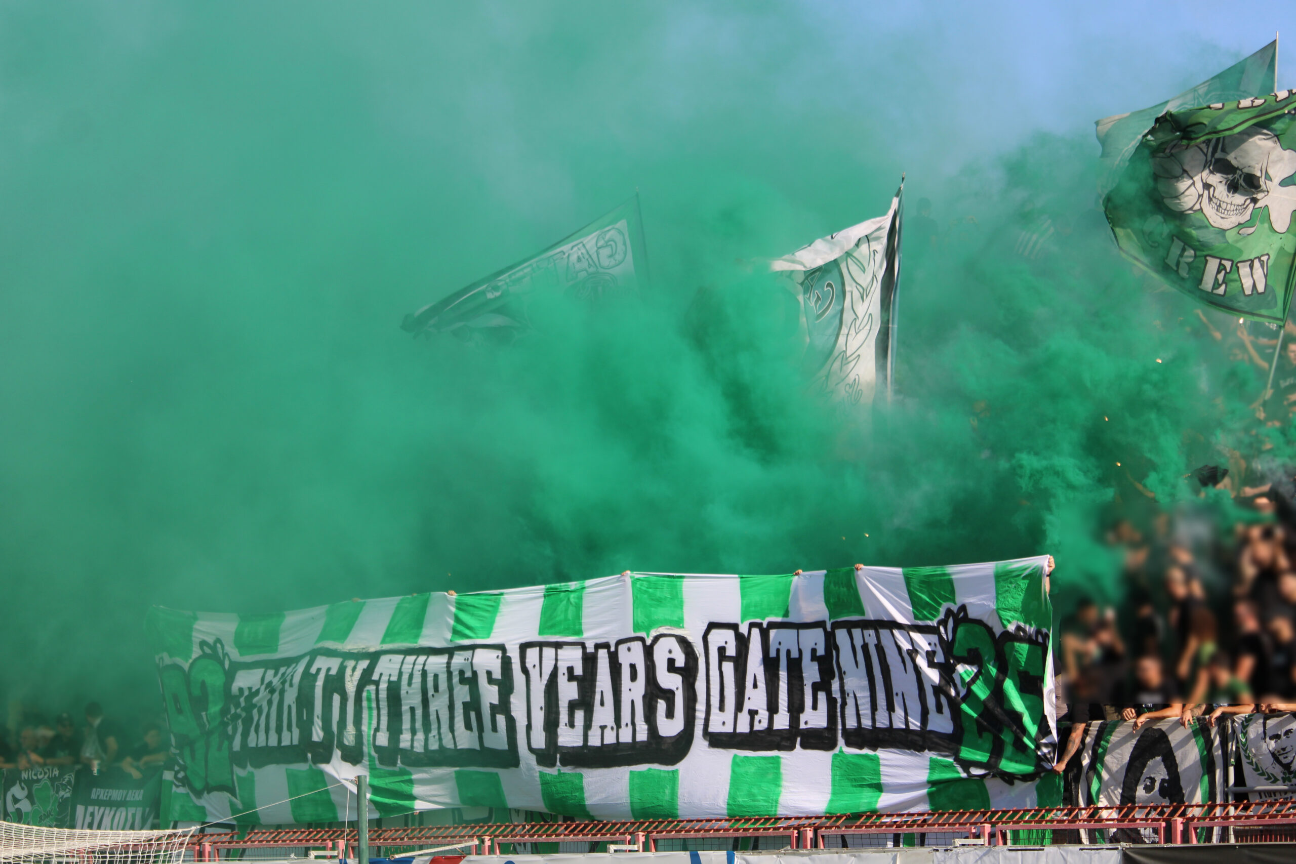 Εντυπωσιακή είσοδος από τη Θύρα 9 σρο σημερινό παιχνίδι απέναντι στον Σπάρτακο, με φωτοβολίδες και καπνογόνα και ένα κεντρικό πανί που έγραφε “Thirty three years Gate 9”.