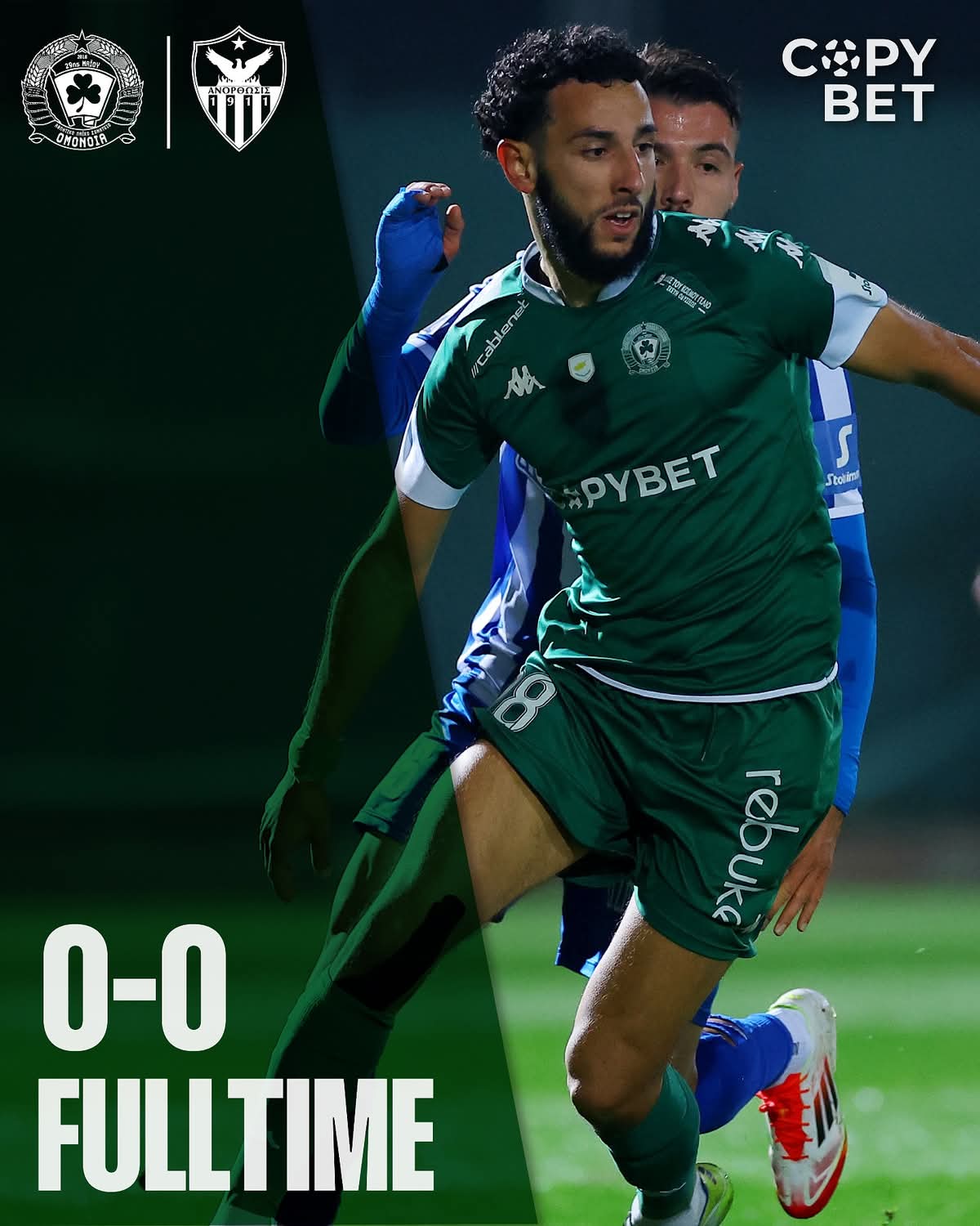 Β ημίχρονο: Με κατοχή μπάλας απο την ομάδα μας ξεκίνησε το Β μέρος. Η πρώτη καλή φάση ήταν ένα σουτ απο το ύψος της περιοχής που απέκρουσε σταθερά ο Στρέζος. Στο 61′ η Ανόρθωση έμεινε με 10 λόγω αποβολής του Ευαγόρα Χαραλάμπους για επικίνδυνο παίξιμο στον Κονομή. Παρά το αριθμητικό πλεονέκτημα οι ποδοσφαιριστές μας δεν είχαν την απαιτούμενη ηρεμία. Στο 70′ ο Κριχόβιακ βρέθηκε σε ευνοϊκή θέση όμως ο Γουίλερ έβαλε το μπλοκ. Μετά το 75′ οι ποδοσφαιριστές μας ανέβηκαν και έκλεισαν τον αντίπαλο στο μισό. Στο 77′ ο Ένεμ προσπάθησε να νικήσει τον τερματοφύλακα στην κλειστή γωνία. Στο 86′ η Ανόρθωση έχασε μεγάλη ευκαιρία με την μπάλα να περνά δίπλα απο το δοκάρι. Στο 90′ τεράστια ευκαιρία με τον Ένεμ απέναντι απο τον τερματοφύλακα να στέλνει την μπάλα ψηλά άουτ. Στο 93’ ο Ζευκής σούταρε στην κλειστή αλλά απέκρουσε ο Ζίβκοβιτς.