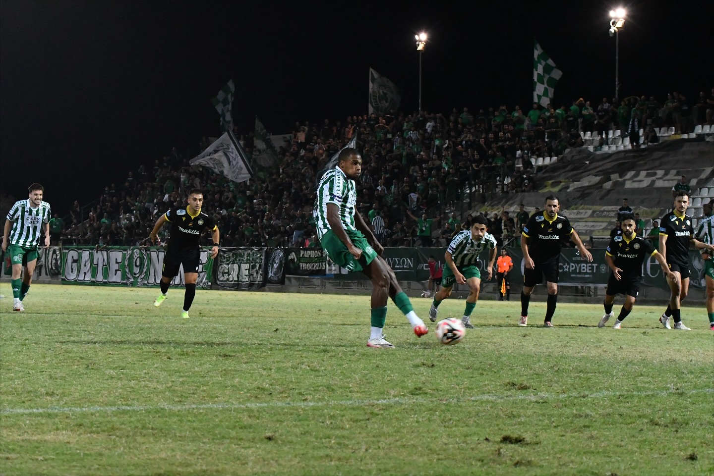 Από την εκτέλεση αυτή, έγινε μια κεφαλιά, απέκρουσε ο Στρατηλάτης και στη συνέχεια υποδείχθηκε πέναλτι για την ΟΜΟΝΟΙΑ μετά από ανατροπή ποδοσφαιριστή μας εντός περιοχής. Το πέναλτι εκτέλεσε ο Μέιρα, με τον Στρατηλάτη να αποκρούει και στην επαναφορά ποδοσφαιριστη της ομάδας μας να στέλνει εξ επαφής την μπάλα έξω!