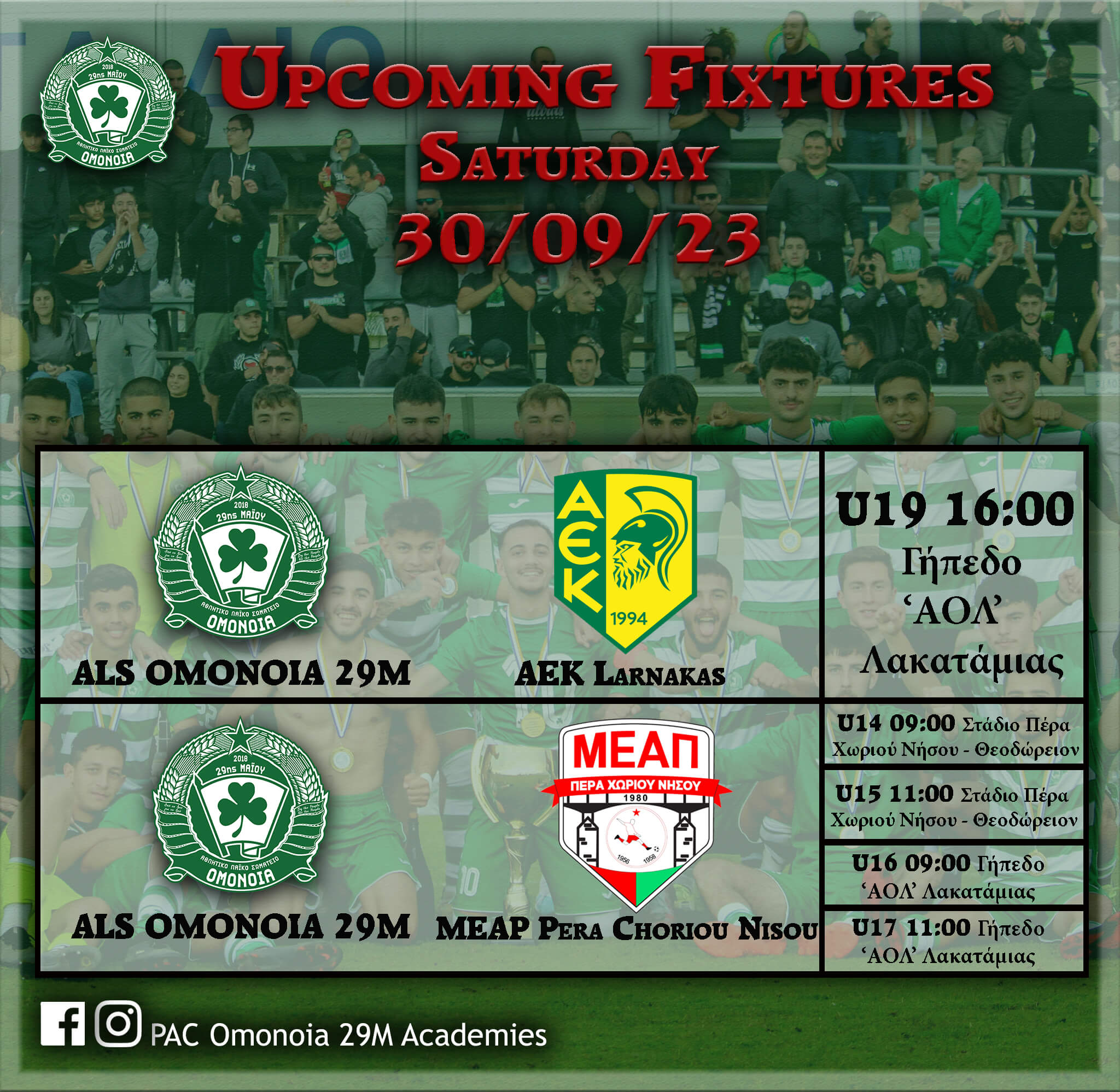 Δεύτερη αγωνιστική για τους ‘μικρους’ μας που θα αγωνιστουν με την αντίστοιχη της ΜΕΑΠ Πέρα Χωρίου Νήσου. Κ14 και Κ15 θα αγωνιστούν η ώρα 9:00 και 11:00 εκτός έδρας στο κοινοτικό στάδιο Νήσου, ενώ Κ16 και Κ17 θα αγωνιστούν 9:00 και 11:00 αντίστοιχα εντός έδρας στο γήπεδο του ΑΟΛ Λακατάμιας.